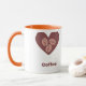 This stylish mug features a heart-shaped design filled with coffee beans and the word “Coffee” below.
