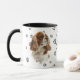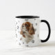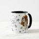 This mug for the Cavalier King Charles Spaniel Dog owner features an adorable portrait of a little brown and white spaniel. The image is printed twice, and between them is an oval with the black text that says "Love my Cavalier King Charles Spaniel". The oval and dog images are placed on a white background sprinkled with paw prints. Your monogram or name can be placed in a text field at the bottom.