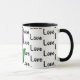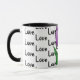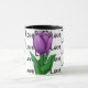 Bonito tulipa roxa da primavera com folhas verdes. O amor é escrito em uma escrita negra em todos os padrões de fundo. Arte original © TamiraZDesign.
