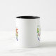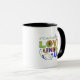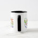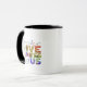 O design de caneca apresenta a mensagem "Love Unites Us" em uma tela ousada e multicolorido. Cada palavra é uma cor vibrante diferente, criando um sentido de energia e inclusividade. O texto em si tem uma fonte limpa e moderna que se destaca claramente na caneca.