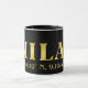 A caneca de café na moda apresenta a cidade de Milão, as coordenadas do mapa italiano de latitude e longitude em fontes douradas sobre fundo preto.