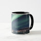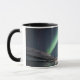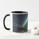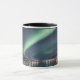 Fotografia paisagística das luzes verdes do Norte (Aurora borealis) refletindo num fiorde congelado na costa do Norte da Noruega, Escandinávia.