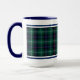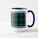 Caneca de café com tartã para Clan MacDonald das Ilhas e suas sebes, incluindo Alastair e Hawthorne. Padrão de xadrez marinho azul e verde florestal escocês de 1842, com acentuações vermelho-claro, branco e preto.