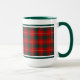 Caneca de café com tartã para Clan MacPhee e suas sebes, incluindo Duffy e Mahaffey. Padrão de xadrez escocesa vermelho-claro e verde-florestal de 1880, com ouro amarelo e acentos brancos.