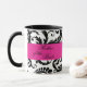 Esta caneca preto e branco chique do damasco com uma banda do rosa quente combina o convite do casamento mostrado abaixo e é personalizada para a mãe da noiva. Faria uma lembrança agradável para sua mamã. O texto é customizável, e você pode escolher de uma variedade de estilos e tamanhos da caneca.