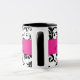 Esta caneca preto e branco chique do damasco com uma banda do rosa quente combina o convite do casamento mostrado abaixo e é personalizada para a mãe do noivo. Faria uma lembrança agradável para sua sogra. O texto é customizável, e você pode escolher de uma variedade de estilos e tamanhos da caneca.