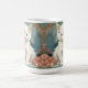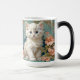Magic Mug com um gato branco no estilo de Alphonse Mucha! Este gatinho liso e de olhos azuis posou com flores cor-de-rosa e cobertores azuis. Um presente fabuloso para amantes de gatos e colecionadores de Art Nouveau!