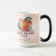 This Morphing Mug features a stylized graphic design illustration of an apricot day celebration poster. The focus is a large, glossy apricot in golden-orange tones with a metallic sheen in the center of the image. The apricot has a green leaf with a golden line detail and a brown stem. The background features circular shapes in pastel pink, teal and mint green colors. The text Apricot Day is written in metallic letters with January 9th below in smaller script. The Apricot Day image is on both sides of the mug. The Morphing Mug displays the image when you put a hot drink in the mug. The mug is a fifteen ounce mug.