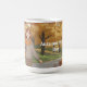 Esta caneca de café apresenta uma cena de outono com uma jovem mulher caminhando em um caminho pavimentado. A mulher está vestindo um suéter esticado, calças marrons e um cachecol laranja. Seu cabelo é auburn e ela tem uma expressão alegre. O fundo apresenta árvores com folhagem de outono dourada e ferrugem. O caminho é uma estrada de asfalto de cinza que se curva levemente até a distância. O texto Autumn Stroll Day (Dia de rolagem de outono) é exibido em texto branco na imagem. As bordas da imagem são decoradas com folhas de outono grandes e estilizadas em cores metálicas prateadas e douradas, criando um efeito de moldura. A caneca é uma mugem que mostra a imagem na caneca quando uma bebida quente é colocada na caneca. A caneca é uma caneca de 15 gramas. A caneca cumpre os requisitos do FDA para a segurança das comidas e bebidas.
