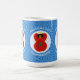 A caneca de morfina mágica apresenta um Anjo da Bandeira marroquina, vestido na bandeira de Marrocos, dentro, um círculo fractal de quadrados rabugentos. O círculo está sobre um fundo fractal azul de quadrados rabugentos. Adicione um nome, feriado e ano para personalizar sua caneca como presente ou para adicionar à decoração de feriados. Adorável decoração de Chanucá. Design nos três lados da caneca.