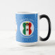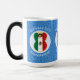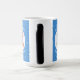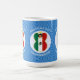 A caneca de morfina mágica apresenta um Anjo da Bandeira Mexicana, vestido na bandeira do México, dentro um círculo fractal de quadrados rabugentos. O círculo está sobre um fundo fractal azul de quadrados rabugentos. Adicione um nome, feriado e ano para personalizar sua caneca como presente ou para adicionar à decoração de feriados. Adorável decoração de Chanucá. Design nos três lados da caneca.