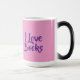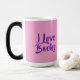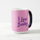 This Morphing Mug displays the words I Love Books. The I Love Books text is on both sides of the mug in purple text. The background of the mug is a pretty pink color. This mug is a Book Lovers Mug. The morphing mug shows the I Love books purple text and pink background when you put a hot drink in the mug. The image is on both sides of the mug. The mug is a fifteen ounce morphing mug.