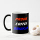 Uma caneca Morphing com design de Águia e as palavras vermelhas, brancas e azuis que dizem "Drinker de Café Orgulhoso".