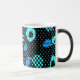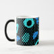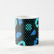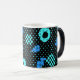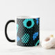 Caneca de café com formas geométricas e cores azuis e turquesas em fundo preto