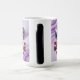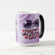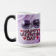This mug features purple sunglasses with gradient gray lenses against a swirled purple and white background. The sunglasses are on the top of the image. Below the sunglasses is text spelling out HAPPY VALENTINE DAY in burgundy letters. Four small red heart decorations are around the text - two on the left side and two on the right side. The background has a smooth, marble-like texture with flowing purple and white swirl patterns. The lighting creates subtle reflections on the sunglasses' lenses. The mug is a morphing mug. When you put a hot drink in the mug the image appears. The image is on both sides of the mug. The mug shown is a fifteen ounce morphing mug.