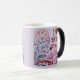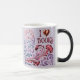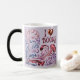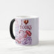 This Lavender Mug displays a decorative art piece with ornate floral and scroll designs in metallic colors on a light purple background. The design is divided into two main sections. On the left side, there is an elaborate swirling pattern in metallic blue, pink, and purple tones, with intricate leaf and petal shapes flowing upward and outward. On the right side, the text I ❤ BOOKS is in metallic burgundy letters, with a 3D heart symbol replacing the word Love. Below the text, there are additional decorative floral elements in matching metallic colors - red, pink and purple - with leaf and petal shapes flowing in a downward curve. The design has a luxurious, bookish aesthetic with a metallic sheen. The books image is on both sides of the mug. The Morphing Mug shows the image when you put a hot drink in the mug. The morphing mug is an eleven ounce mug.
