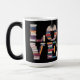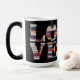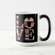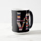 This Morphing Mug displays a stylized typographic design spelling out the word LOVE using stacked hardcover books on a black background. The letter L is made from dark blue and purple books, the O is created with red and orange books, the V is formed with yellow and teal books and the E is constructed with green and purple books. The LOVE books image is on both sides of the mug. The Morphing Mug shows the image when you put a hot drink in the mug. The mug is a fifteen ounce mug. This mug meets the FDA requirements for food and beverage safety.
