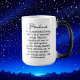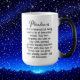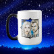 Arte AI retratando uma raça terrestre extra alienígena Pleiadiana masculina e feminina com um fundo de OVNI estrelado. Enumerados no verso da caneca de café estão os traços e características de um Pleiadiano.
