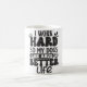 Caneca de boa qualidade, bom tamanho, não parece ser aquela louça que trinca ou descasca. Com os cuidados necessários, irá ter boa durabilidade. Antes de se colocar a bebida quente, ela fica preta, mas numa cor bem brilhante. Meu namorado é DJ e encomendei esta caneca pra um café da manhã com o pessoal da equipe! Sei q será o maior sucesso...em breve sei q vão pedir pra eu encomendar pra eles, e penso em fazer com o nome da empresa também. A caneca é muito legal, a coisa da trasmutação...mas o q não ficou muito legal foi a impressão da imagem da foto, não ficou como a foto q enviei...sei q mandei uma foto q é uma sombra, mas se as cores q estão em voltam aparecessem, ficaria bom. Na parte da frente ficou boa, mas atrás dele, a iluminação azul não saiu, ficando assim muito escuro, e não dá pra ver q é a sombra de uma pessoa. Se a Zazzle tivesse me enviado um e-mail dizendo q isso aconteceria, eu teria enviado uma foto mais clara, mas como a imagem de teste q tenho no site está nítida, pensei q fosse ficar assim. O chato q a caneca é presente, e a pessoa q ganhou, não consegue se ver na foto. Ficou sem propósito no final das contas. =(