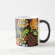 Whimsical Garden Owl Mug. A colorful illustration of a cheerful owl surrounded by vibrant abstract flowers and leaves on a dark background.