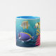 Esta caneca bicolor tem uma cena submarina colorida de peixes pequenos e corais em toda a caneca. A alça e o interior da amostra são de cor azul-celeste.