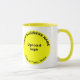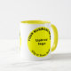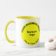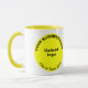 Combinação personalizável amarela com marca comercial em forma redonda. Mug que você pode usar no seu compro de café, restaurante ou restaurante para criar reconhecimento de nomes de marcas enquanto seus clientes gostam de tomar café ou chá aromático e saboroso que você serviu a eles. Como produto de promocional, dê item ou presente a seus clientes ou clientes, uma estratégia de marketing para anunciar sua empresa ou promover sua marca. Para personalizar esta caneca, carregue o logotipo da sua empresa, digite o nome da sua empresa, cidade ou cidade e estado. Verifique a aparência nos lados frontal e traseiro após carregar o logotipo e os textos de digitação. Se a aparência lhe agrada, você pode colocar seu pedido agora. Se você precisar redimensionar e mover o logotipo e os textos para o ajustado na modelo desta caneca ou no tamanho e estilo que você escolherá, mude na ferramenta design. Você também pode fazer outras alterações na ferramenta design, como alterar a cor da fonte, o estilo da fonte, a cor da forma redonda e adicionar a cor do plano de fundo.