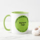 Combinação personalizável de verde limão com a marca de negócios em forma redonda. Mug que você pode usar no seu compro de café, restaurante ou restaurante para criar reconhecimento de nomes de marcas enquanto seus clientes gostam de tomar café ou chá aromático e saboroso que você serviu a eles. Como produto de promocional, dê item ou presente a seus clientes ou clientes, uma estratégia de marketing para anunciar sua empresa ou promover sua marca. Para personalizar esta caneca, carregue o logotipo da sua empresa, digite o nome da sua empresa, cidade ou cidade e estado. Verifique a aparência nos lados frontal e traseiro após carregar o logotipo e os textos de digitação. Se a aparência lhe agrada, você pode colocar seu pedido agora. Se você precisar redimensionar e mover o logotipo e os textos para o ajustado na modelo desta caneca ou no tamanho e estilo que você escolherá, mude na ferramenta design. Você também pode fazer outras alterações na ferramenta design, como alterar a cor da fonte, o estilo da fonte, a cor da forma redonda e adicionar a cor do plano de fundo.
