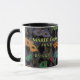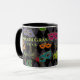 Esta caneca de café Mardi Gras apresenta máscaras mascarada brilhantes em verde, rosa, roxo vermelho, turquesa e laranja sobre um fundo de diamante preto e cinza harlequin. Personalize com o ano de férias e um nome na tipografia do verde limão. Concebido pelo artista mundialmente famoso ©Tim Coffey.