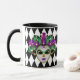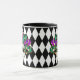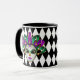 Esta caneca combo preta e branca tem uma imagem de uma máscara festiva Mardi Gras sobre um impressão de padrão de diamante preto e branco. Personalize este item ou comprar conforme projetado.