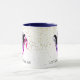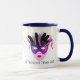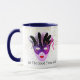 Esta caneca azul e branca combo tem uma imagem de uma máscara do Mardi Gras sobre as pequenas estrelas a cores do ouro sobre um fundo branco. O texto de "Deixe os bons tempos rolar' está debaixo da máscara em Cada lado da caneca. Personalize este item ou comprar conforme projetado. Cores: alça e interior azuis profundos, fundo branco, estrelas ouros e um impressão colorido de puras, máscaras vermelhas e pretas. Imagens e texto impressos em.