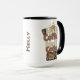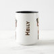 Design humorístico para programadores ou codificadores. Duas xícaras de café "para ir" no topo com as palavras "Half Coffee, Half Coder" escritas em marrom divertido e bege, com uma ilustração do teclado na parte inferior. A design está em ambos os lados da caneca, com um lugar no meio para personalizá-la com um nome. Disponível em vários tamanhos, alça de caneca e cores interiores, incluindo branco.