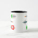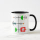 Esta caneca tem um design moderno século médio que se parece com um móvel com meio círculo, retângulo inclinado, triângulo, linhas e círculos em vermelho, verde, verde, cor de rosa, laranja e preto.