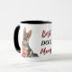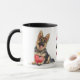 "A melhor mãe do cão" declara esta caneca fofa no centro. A imagem em cada lado é uma imagem adorável de um Cachorro German shepherd oferecendo um coração vermelho. Perfeito para Dia de as mães ou aniversário dela! Todo o texto é personalizável, então você também pode alterá-lo para Pai no Dia de os pais.