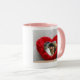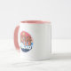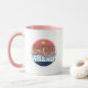 melhores dias, Mug. Lâmina Branca, Alça Rosa, Mensagem Positiva, Design Colorida, Citação Motivacional. Uma caneca branca com manípulo rosa e interior, com um design vibrante com o texto "MELHORES DIAS" em letra estilizada. O fundo inclui tons de azul, rosa e laranja, juntamente com uma ilustração de um sol, transmitindo uma mensagem de otimismo e esperança.
