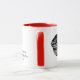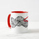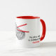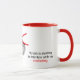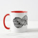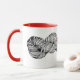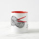 Uma caneca personalizável para um croqueteiro afiado com as palavras "Meu trabalho está começando a interferir no meu crochê" e decorada a preto e vermelho com uma casca de lã e dois ganchos de crochê.