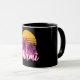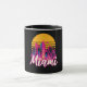 Ilustração do design de texto "Miami" no estilo retrô com decoração de solários e arranha-céus em rosa, amarelo e roxo