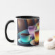 Uma caneca de café colorido e moderna. O que vai bem com o café? Mais café!