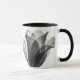 A close-up, monochrome photograph showcases a tulip flower against a bright white background. The flower's petals are delicately rendered, with visible veins adding texture. The image captures the flower from a low angle, emphasizing its upward reach. The stem is slender and dark, contrasting with the lighter petals. The overall mood is serene and elegant, highlighting the flower's natural beauty.