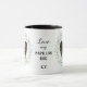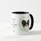 "EU AMO MEU CÃO PAPILLON" declara esta caneca para o dono de cão Papillon. Cada lado da caneca tem um retrato de um adorável Papillon preto e branco enquadrado por folhas de eucalipto verde suave em aquarela. Entre as duas imagens está o texto, que pode ser facilmente personalizado, ou até removido por você, e seu monograma ou nome.