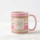 Esta caneca tem um belo e simplista padrão de listras e pontos em tons de rosa, marrom e creme. A letra do monograma na caneca é personalizável e faria um presente personalizado de excelente.