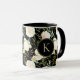 Monograma, Vanilla Flores brancas de cor d'água, acentuadas por folhagem verde sobre fundo preto. Altere facilmente o monograma de modelo para o inicial desejado usando a ferramenta de edição do Zazzle. Consulte a nossa coleção para obter itens correspondentes. Totalmente personalizável e transferível. Monograma Romântico Floral Vanilla Green Watercolor Mug. Artista Yulia Podlinnova
