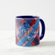 Caneca personalizada com seu próprio monograma (opcional) em uma manta de retalhamento baseada em jeans azuis ou design de colcha. Abaixo do monograma está uma forma de círculo personalizada. Você também pode escolher uma forma retangular se quiser adicionar textos mais longos.