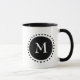 Caneca monográfica branca e preta, com um círculo pontilhado preto e uma inicial monográfica branca personalizada.
