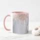 Uma caneca elegante, feminina e de vidro. Rosa dourado e cor-de-rosa, pingado, pintura pingando. Fundo metálico de aparência fina prateada. Personalize e adicione suas iniciais, letras do monograma. Letras rosa douradas.