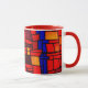 Branco e vermelho 11 oz. caneca combinada com a imagem de um mosaico de vidro vermelho, laranja azul e amarelo manchado. Ver pote de doces, frasco, placa de papel, azulejo de cerâmica quadrada, trivet quadrada e portas copos. Veja toda a coleção This & Aquela Mug na seção HOME.