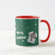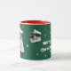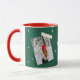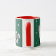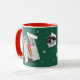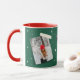 Uma linda caneca acolhedora com flocos de neve e fotos personalizadas de um querido ou cão. Uma caneca de presente com flocos de neve em um fundo verde para um Natal ou um presente de ano novo. Estilize fotos coladas à parede com pedaços de fita adesiva.