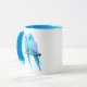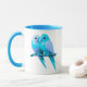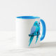 Deux oiseaux en couple bleu clair en porcelaine brillante avec reflets de lumières sur un perchoir.