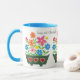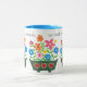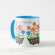 Uma forma excelente de comemorar seu dia especial com uma bonito caneca de café branca com caixas de janela de flores coloridas para combinar com sua papelaria de casamento, de uma colagem de papel pintada à mão por Judy Adamson. O texto é totalmente personalizável.
