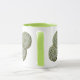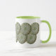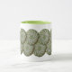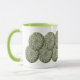 Padrão Espiral. Imagem cortada na rodada. Centro e fundo em verdes variados e espiral em branco. O Motif é replicado de modo que duas linhas de seis rodadas sejam sobrepostas.