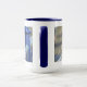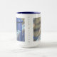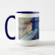 O pardal vermelho está sentado na grade de ferro azul de uma cerca. A imagem é duplicada em cada lado do texto "Bom dia", passando verticalmente pela lateral da caneca.